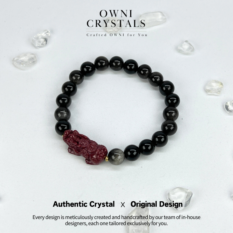 【OwniCrystals】招财貔貅 Wealth PiXiu Protection Silver Obsidian red Cinnabar 银曜石 红朱砂 Natural charm crystal bracelet bangle unisex 天然水晶男款手链大珠