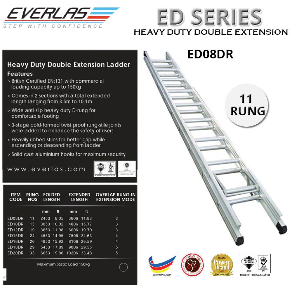 ''EVERLAS'' DOUBLE EXTENSION ALUMINIUM LADDER 8 STEP ED-08 8' X 8'