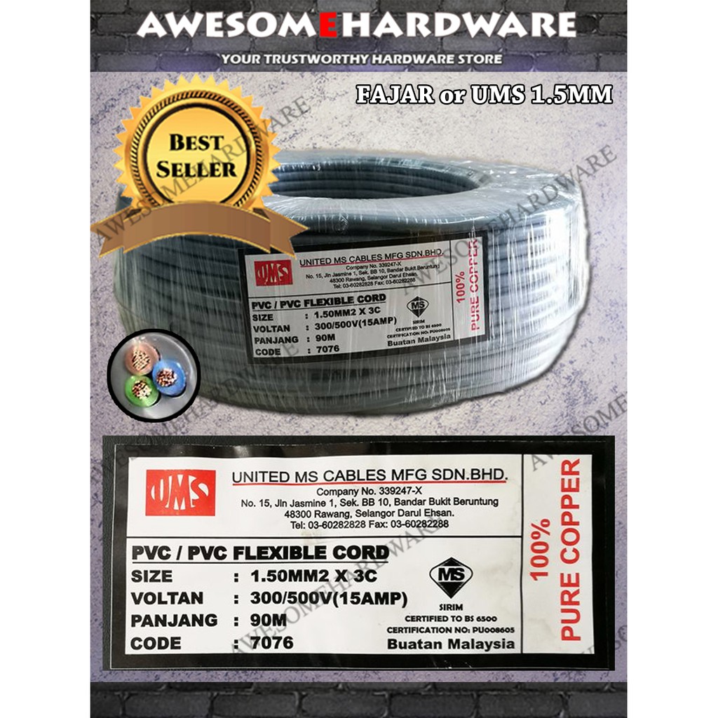 (1 METER) UMS 1.5MM x 3CORE HEAVY DUTY FULL COPPER SIRIM ELECTRIC CABLE WIRE