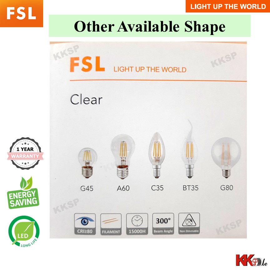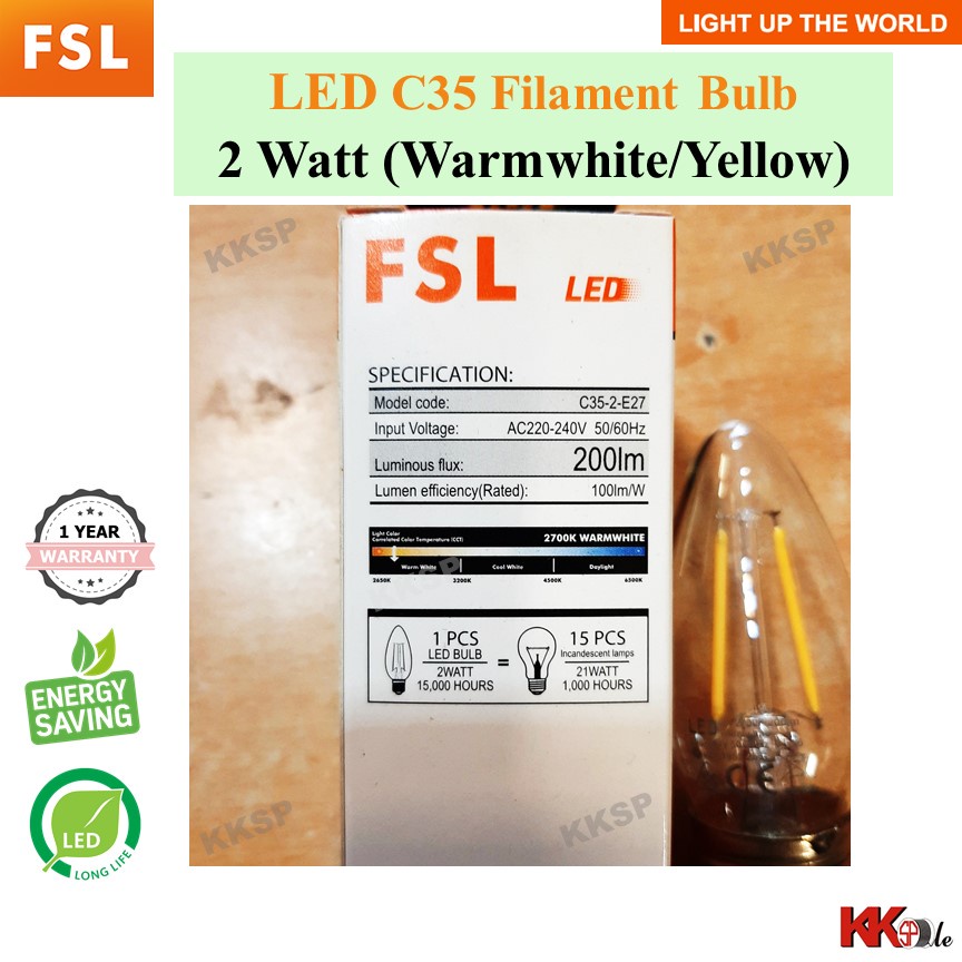(1 Year Warranty) FSL C35 2W LED Filament Bulb E27 Filament LED light bulb - Warmwhite 2700K / Yellow