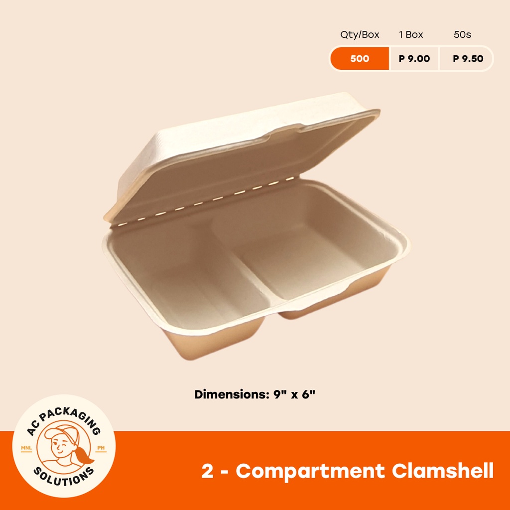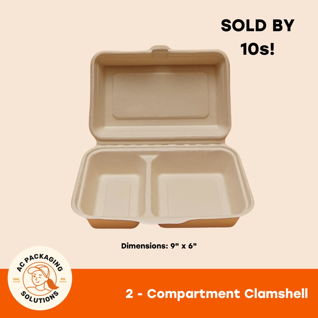(10 pcs) 2 Compartment Clamshell Sugarcane Bagasse