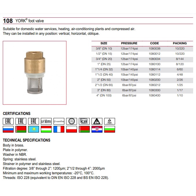 (100% ORIGINAL )"YORK" BRASS SPRING FOOT VALVE (3")