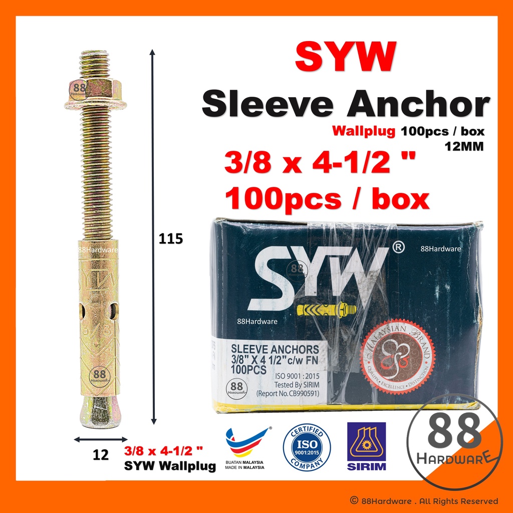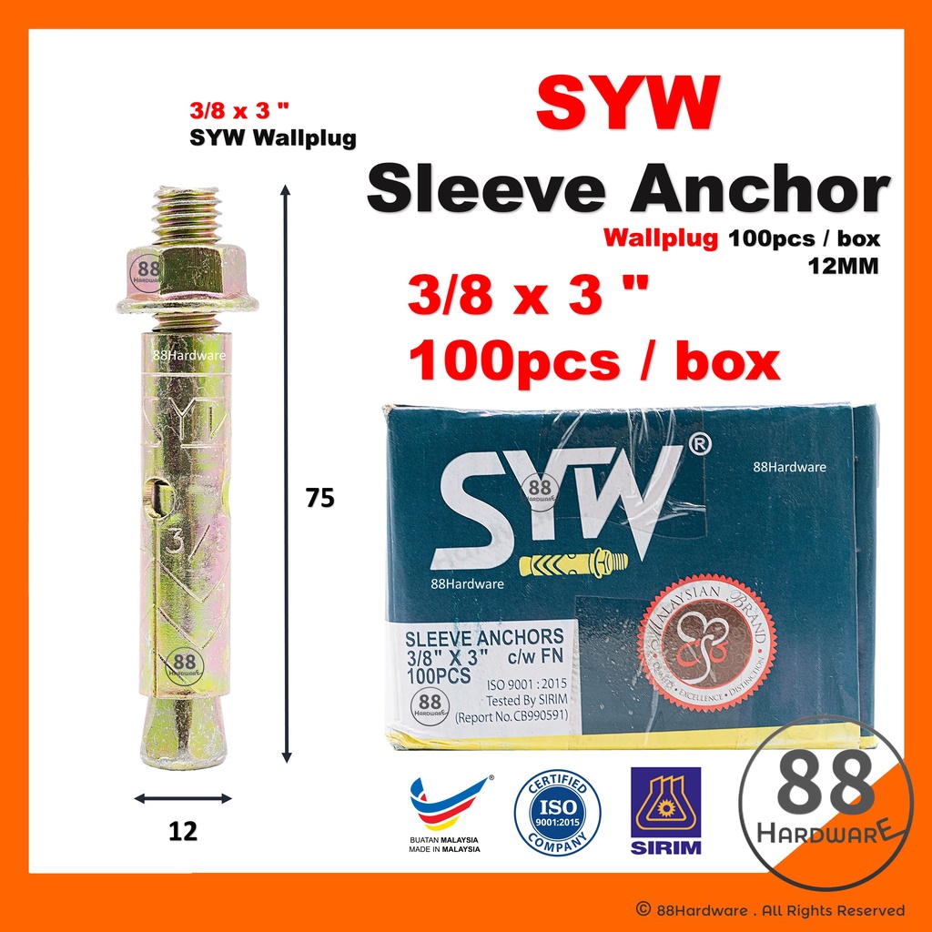 (12MM) 3/8 x 3" & 3/8 x 4 1/2" SYW wall plug / wall plug besi / 12mm wall plug / wallplug /sleeve anchor/dinding/screw