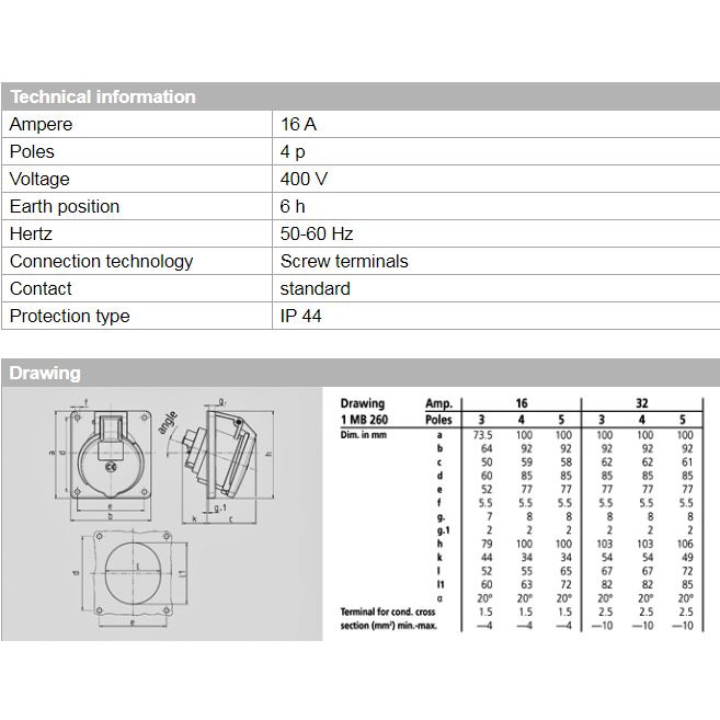 (AMPMECH) MENNEKES SOCKET 1467/ 1492 RECEPTACLE; PANEL MT,16A-4P-415V/ 32A-3P-230V, IP44