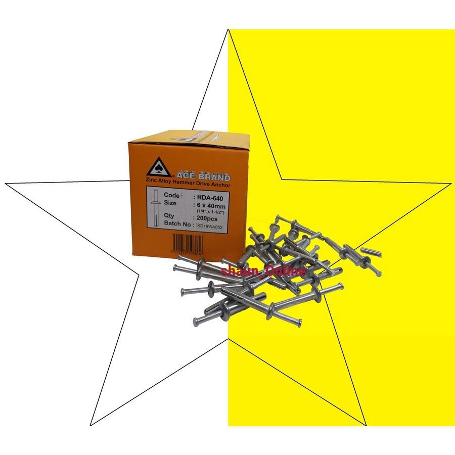 (Box) - "ACE BRAND" 650# 6 x 50mm Hammer Drive Wall Plug Anchor (wall plug paku besi)