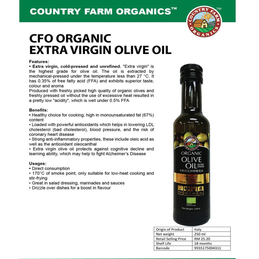 Country Farm Organic Extra Virgin Olive Oil (Cold Pressed), 250ML, EXP 12/2026