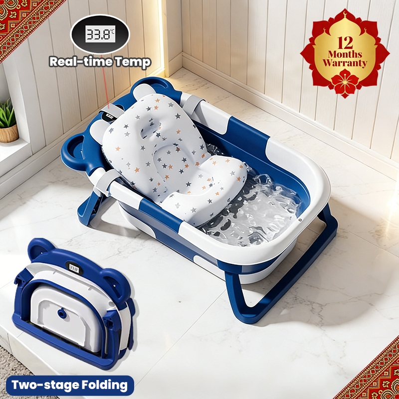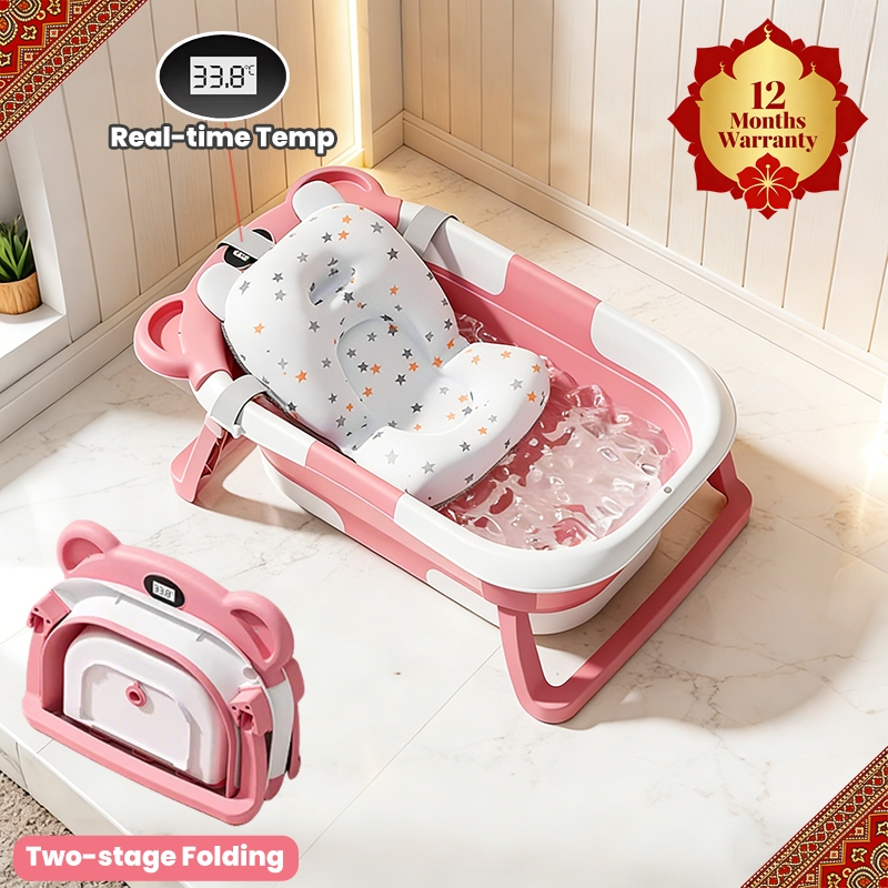 (FREE MAT) Baby Bath Tub Newborn Foldable Tab mandi baby Adjustable sturdy tempat mandi baby with Bathmat & Thermometer