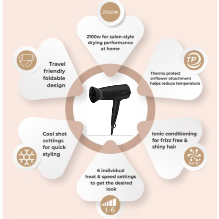 Philips Professional Hair Dryer BHD356 2100W Thermoprotect, Air Flower Advanced Ionic Care, 3 Heat & 2 Speed Settings