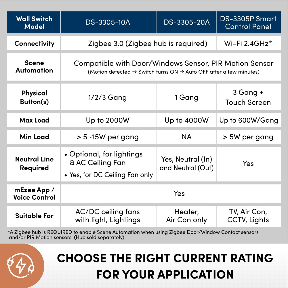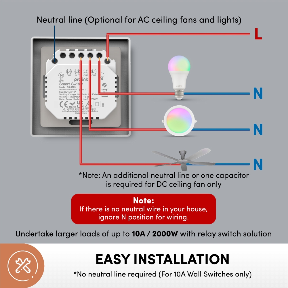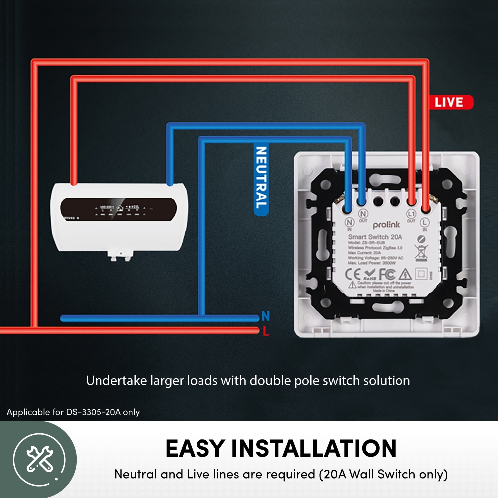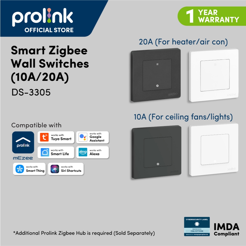 (No Neutral line*) Prolink DS-3305 Smart Zigbee Wall Switch (10A ceiling fan/light) (20A Heater/ Air con) BTO