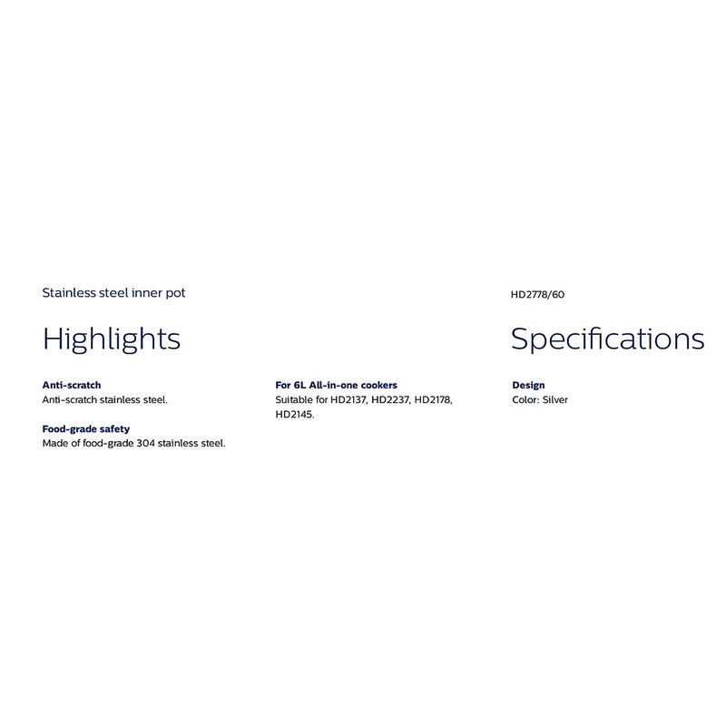 (RM75 & RM 143 AFTER 10% Cashback )Philips Pressure Cooker Inner Pot HD2778 (6L Stainless Steel) for HD2139 & HD2137