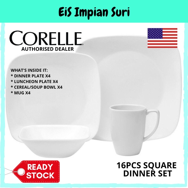 (Ready Stock!!) Corelle Winter Frost (Pure White) Square 16pc Dinnerware Set Livingware Dinner Set