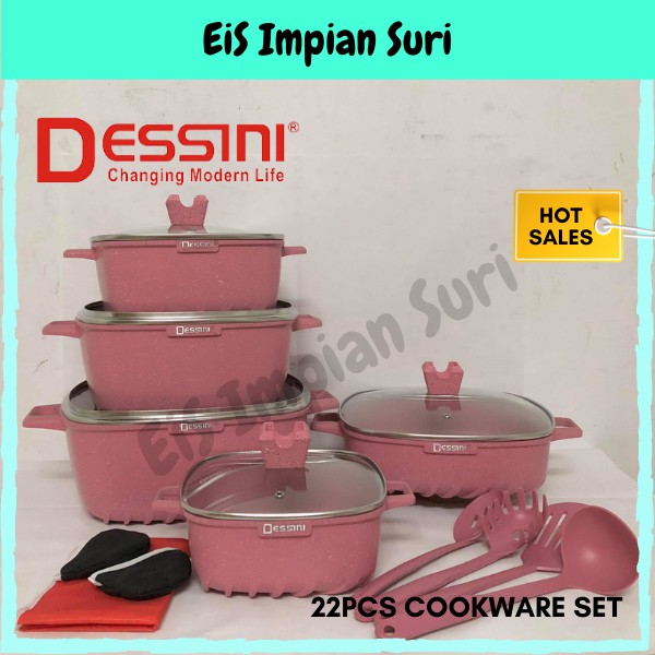 (Ready Stock!!) Dessini Original 22pcs Square Granite Cookware Set Periuk Non-Stick Periuk Masak Cooking Pot