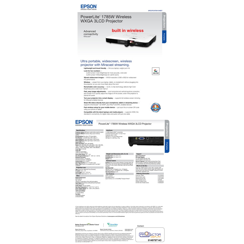 (Ready Stock) Epson EB-1785W 3200 Ansi Lumens WXGA WIFI / Wireless 3LCD Portable Slim Projector | Ultra Slim Projector