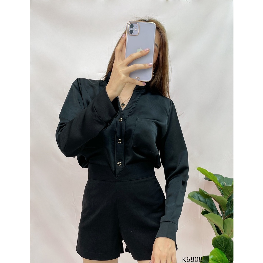 (Real Product Photo) Long-Sleeved Shirt With Trim Black (K6808)