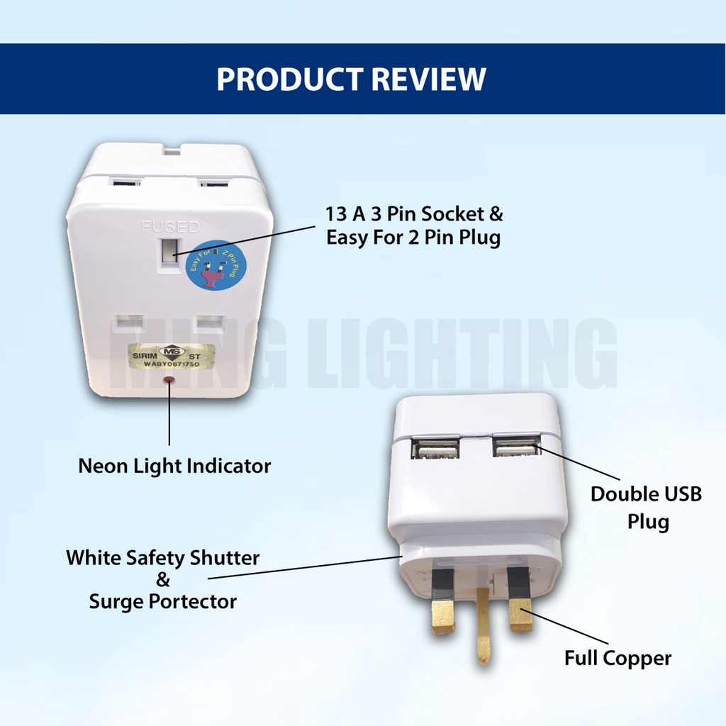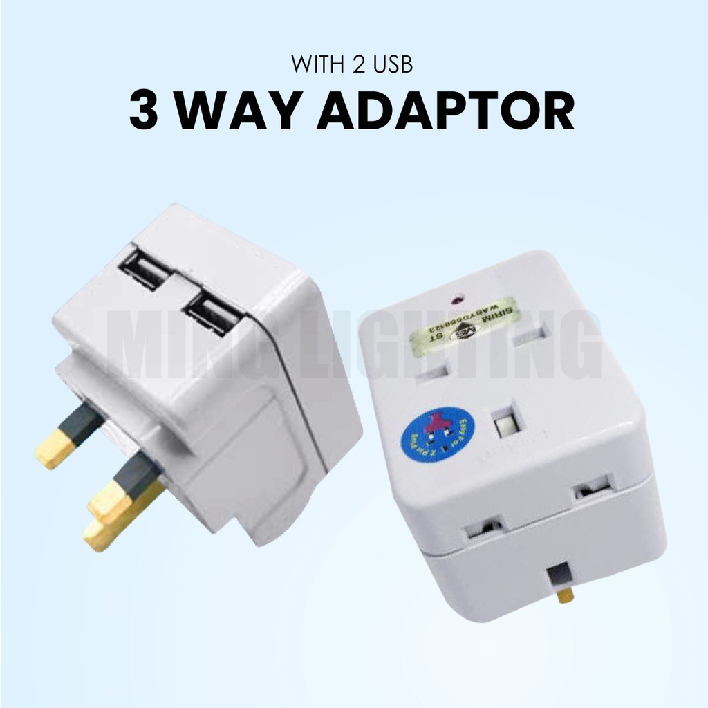 (SIRIM) 13A 3 Way 2 USB Multiple Adapter with Charger 3 Pin Socket Plug Extension Plug Switch Adaptor Neon Light