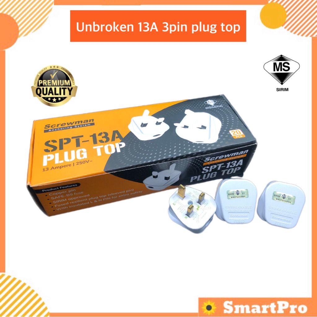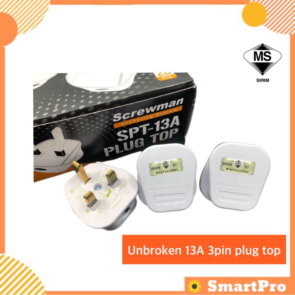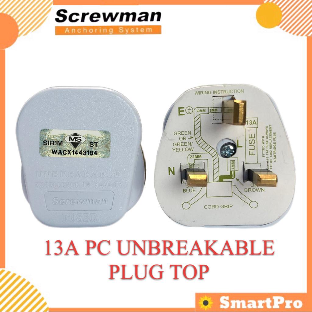 (SIRIM) Screwman 13A Plug Top 3 Pin UK Type Plug Top Unbreakable Plug Top White