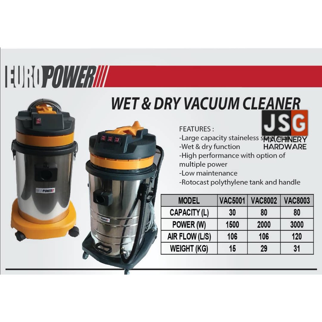 EUROPOWER VAC5001 1800W Wet & Dry Vacuum Cleaner 30L Stainless Steel – Heavy Duty