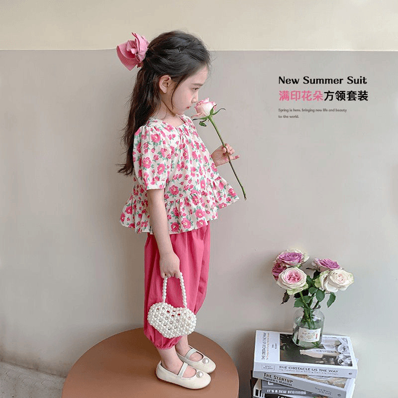 [1-13yrs] 90-160cm Girls Summer Suit, New Style Fashionable Square Neck Floral Suit, Small Medium Girls Suit, Girls Short-Sleeved Suit, Korean Version Children's Clothing