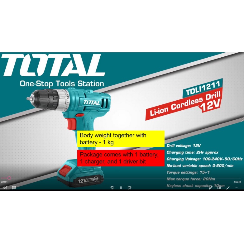 [100% ORIGINAL] TOTAL BRAND 12V Cordless Drill TDLI1211