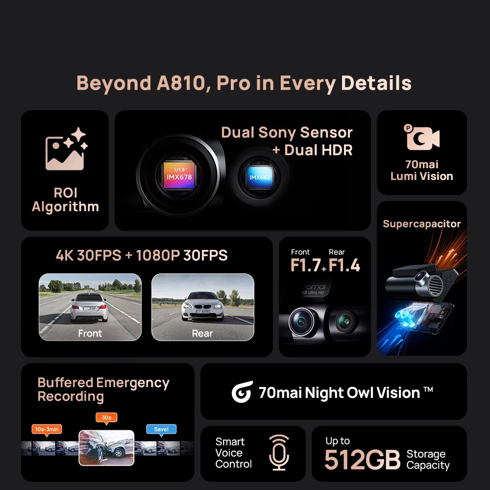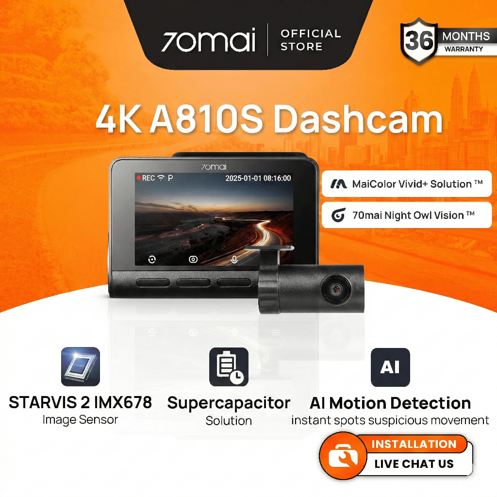 [NEW] 70mai A810S Dash Cam 4K Resolution + HDR | 4G Connectivity | Built-in GPS & ADAS | Dual SONY HDR | Supercapacitor