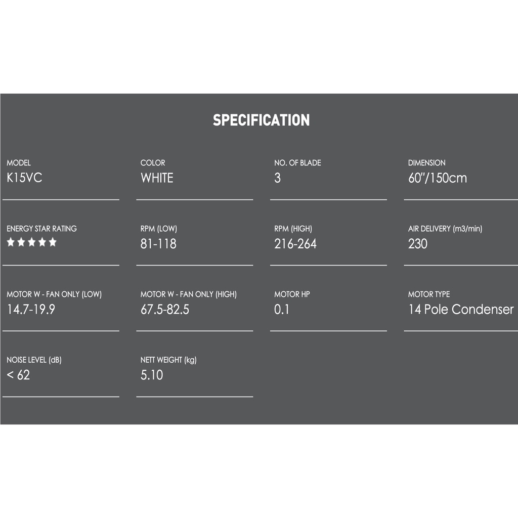 [2 UNITS] KDK K15VC TWIN PACK PROJECT REGULATOR CEILING FAN (150CM / 60") WHITE KIPAS SILING PROJEK
