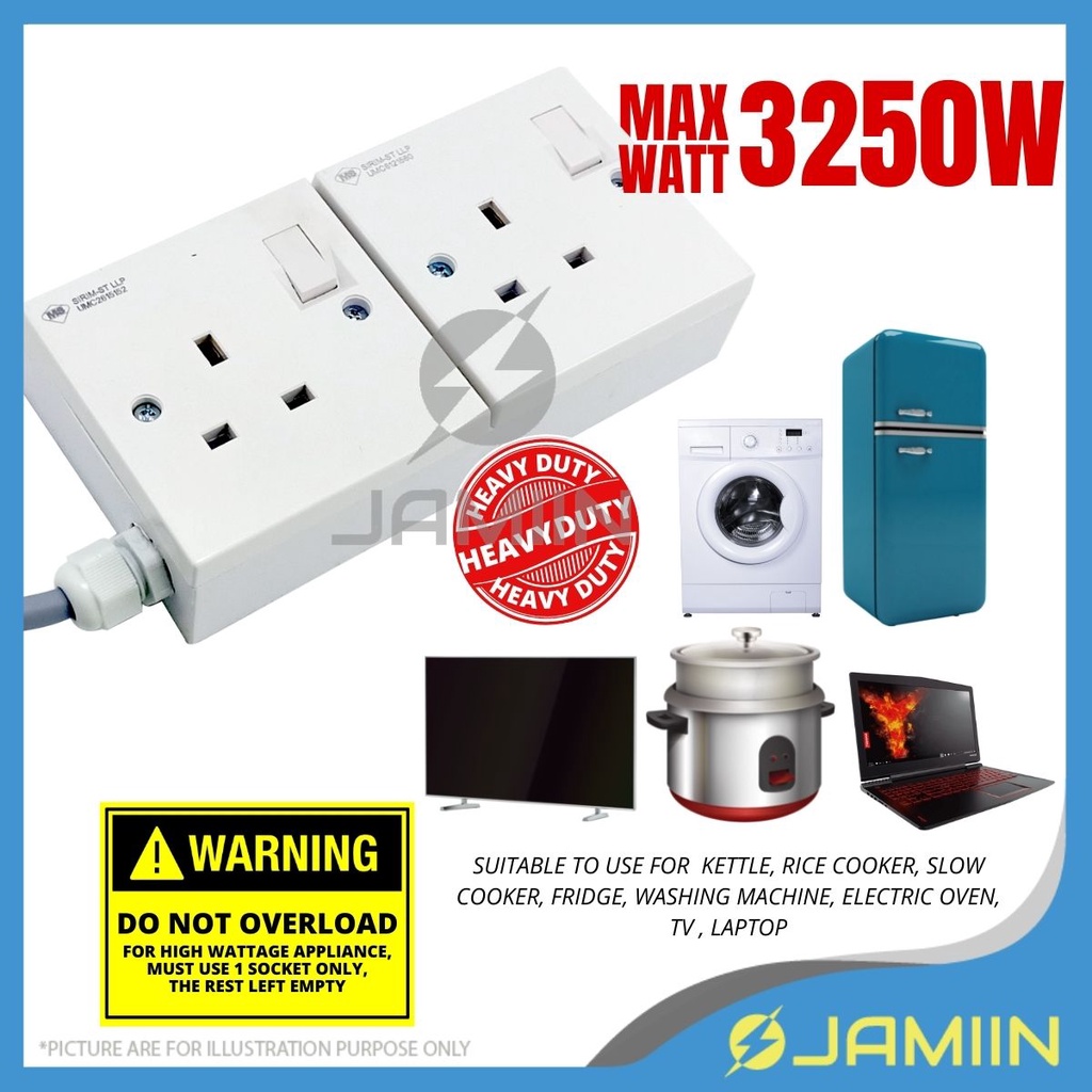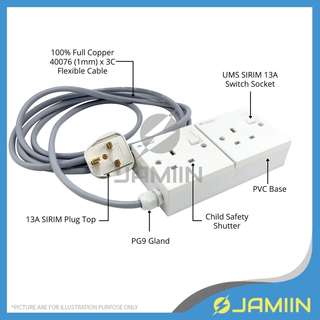 [2 WAY] Extension Plug Box Wire Copper Heavy Duty Extension Power Socket 13A 3 Core UMS Soket Wayar Extension