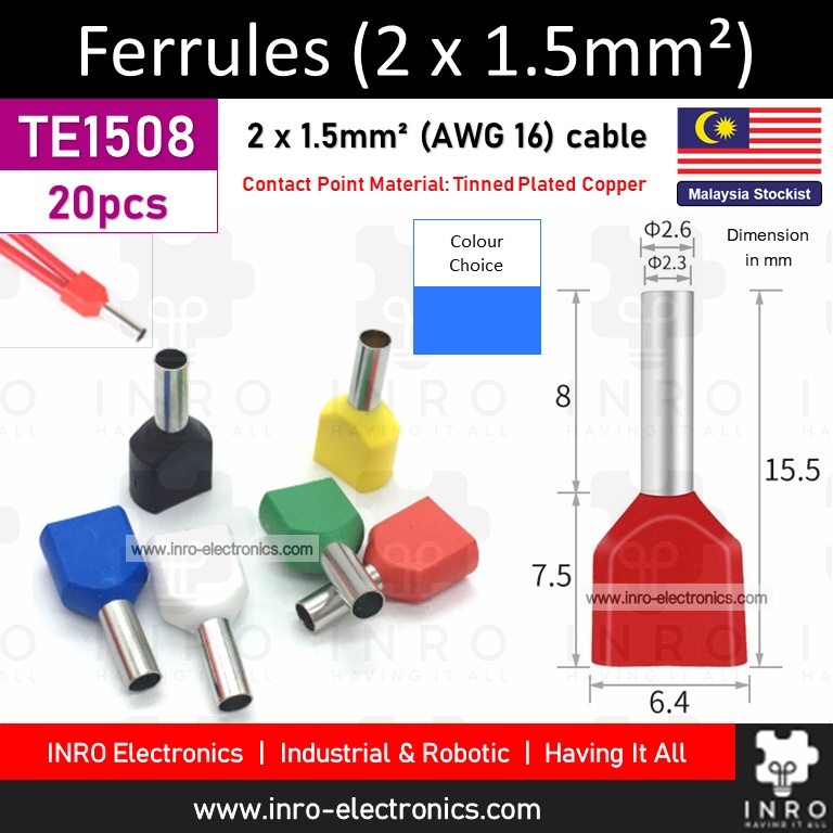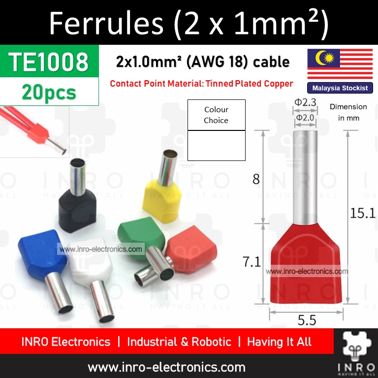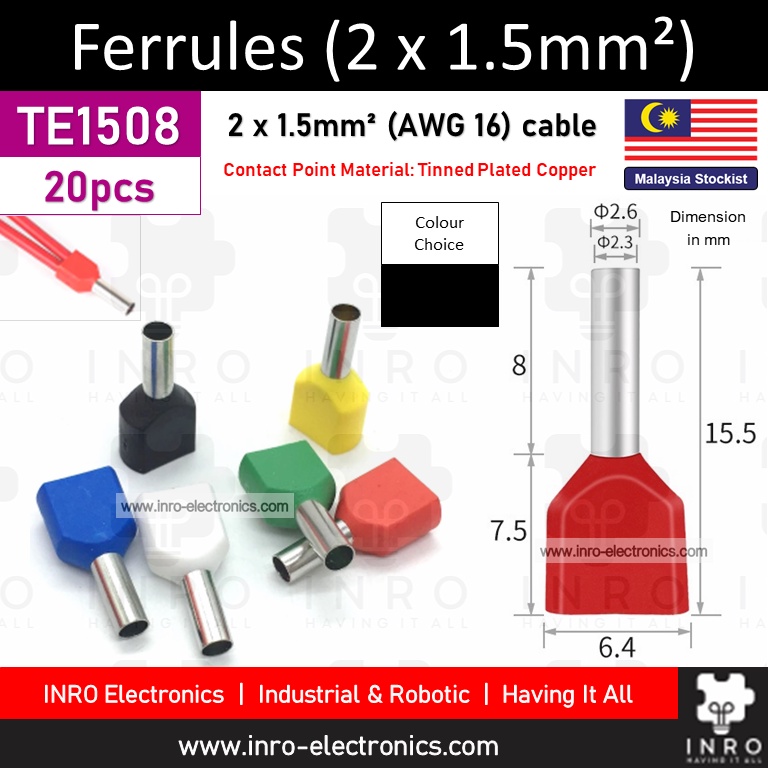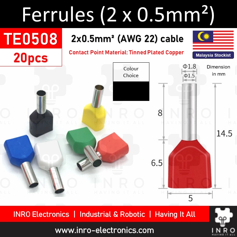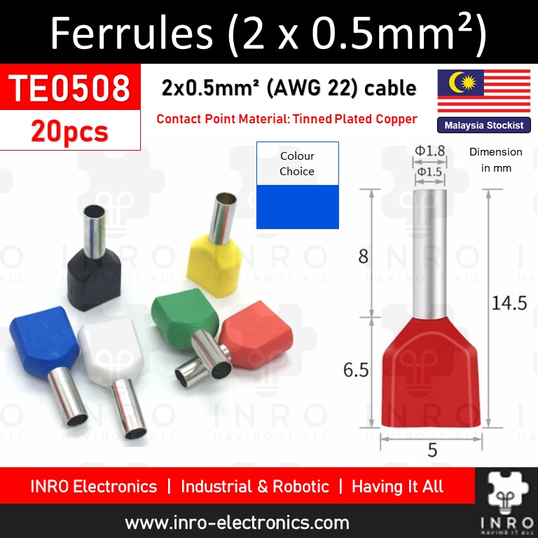 [20pcs] Twin Wire Ferrules Ferrule, 0.34, 0.50-2.5mm2, TE0508 TE7508 TE1008 TE1508 TE2508 TE4012 TE6014 TE10-14