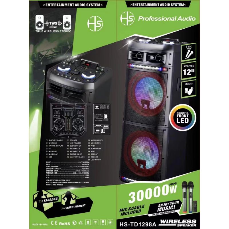 [30000W] HANSUO HS-1298A SUPER KING 12"WOOFER x2 WIRELESS BLUETOOTH SPEAKER TROLLEY RECHARGERABLE WITH LED LIGHT KARAOKE