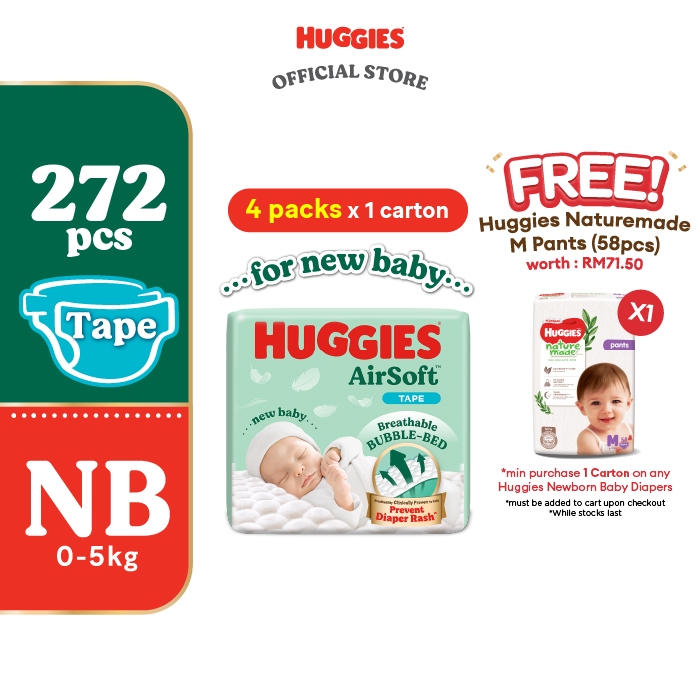 [Bundle of 4] HUGGIES AirSoft Tape NB68/S58/M52/L44/XL38 - Breathable and Soft Premium Diapers for Baby