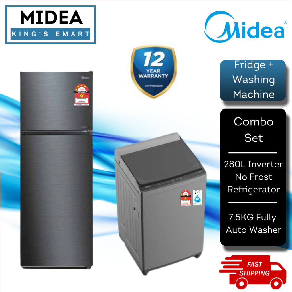 [COMBO SET] Midea 2 Door Refrigerator (200L) MDRT267MTB30 & Fully Auto Washing Machine (7.5kg) MA100W75 / MDRT306MTB30