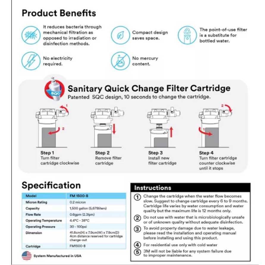 [FREE SHIP]3M FM1500 B Under Sink Water Filter 3M WF-CTG-FM1500 Cartridge for Under Sink Drinking Water System FM1500-B