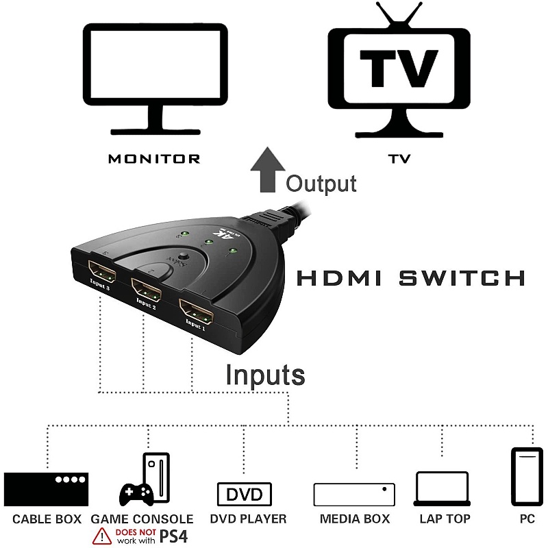 [FREE SHIPPING] HDMI Switcher 3 in 1 out 3 Port 4K HDMI 3x1 Switch Splitter with Pigtail Cable Supports Full HD 4K1080P 3D Player Video converter