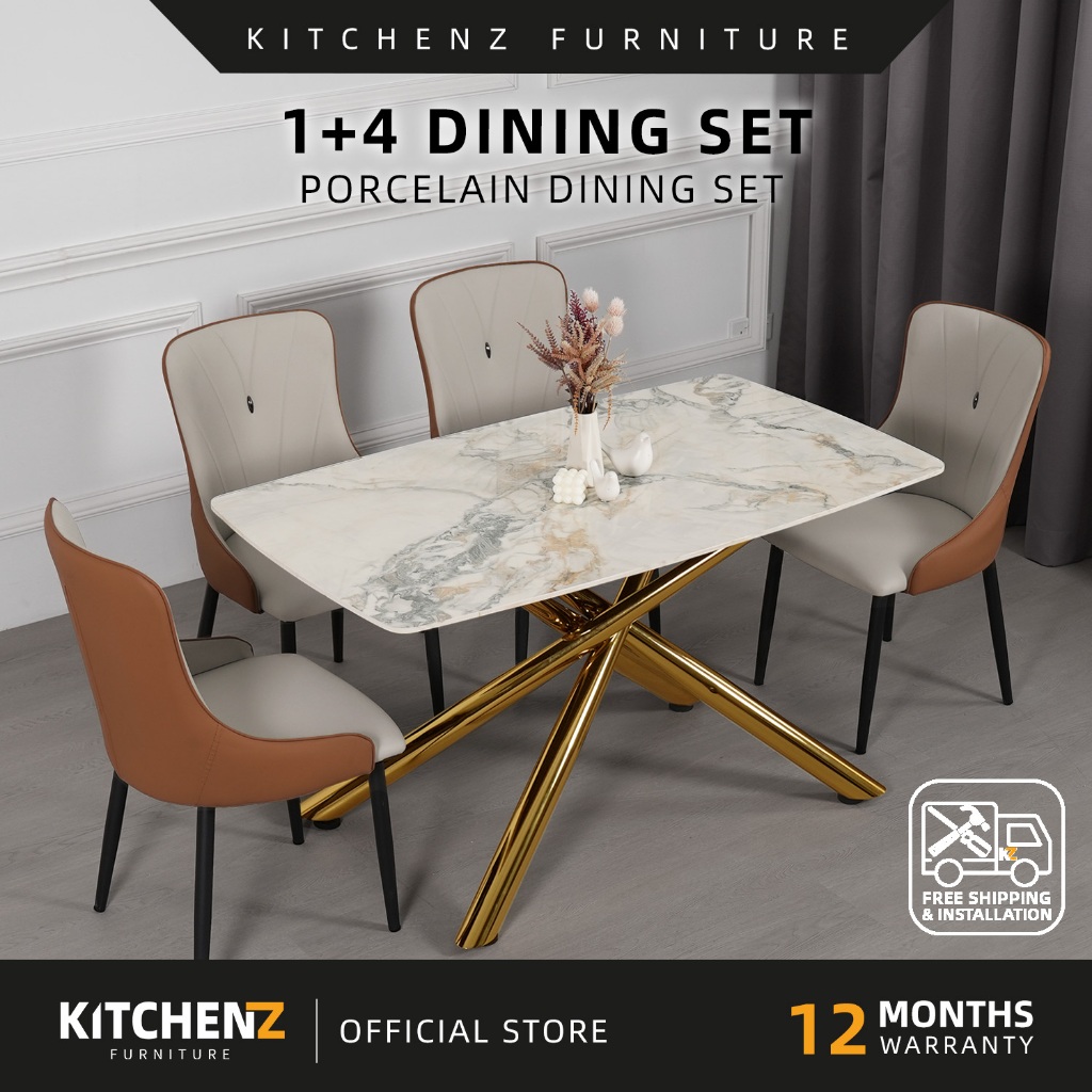 [FREE Shipping & FREE Installation] KitchenZ 4/6 Seater Porcelain Table Top Metal Leg Dining Set with PU Chair