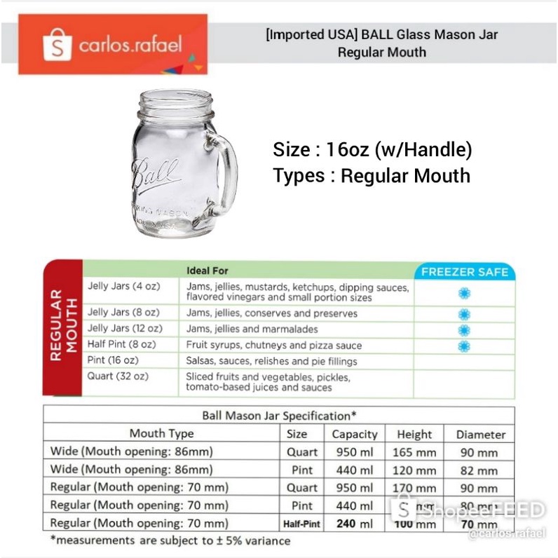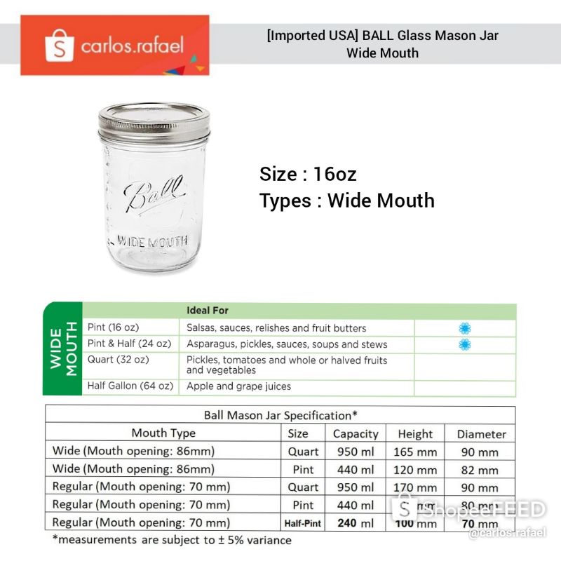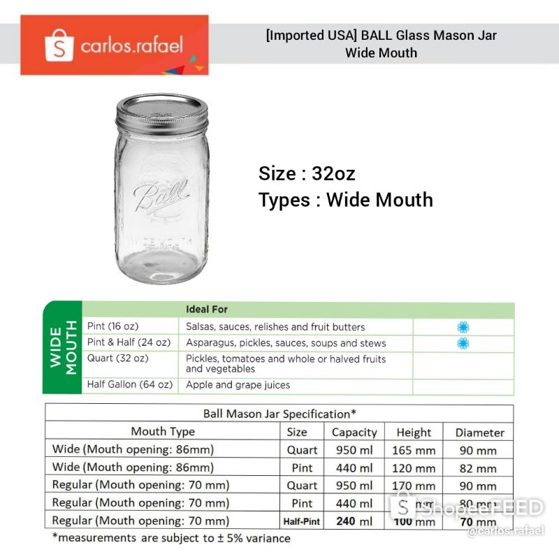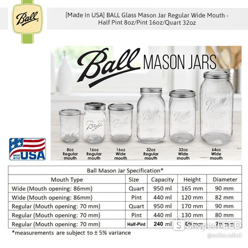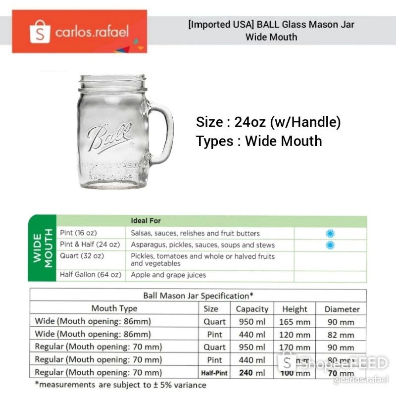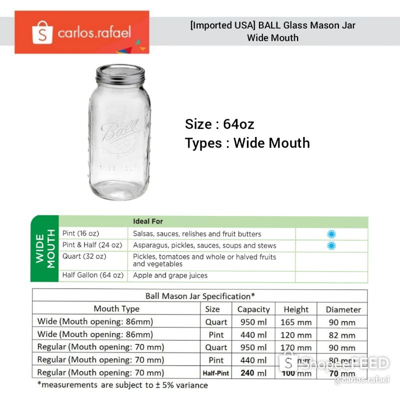 [Imported USA] BALL Glass Mason Jar Regular Wide Mouth with Handle - Half Pint 8oz/Pint 16oz/Quart 32oz/Half Gallon 64oz