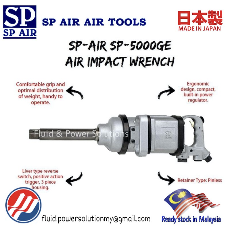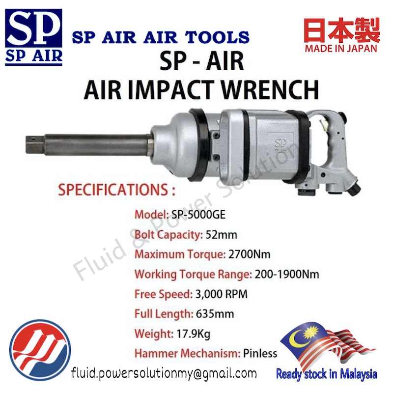 " JAPAN " SP Air Tools 1" Dr Sq Impact Wrench SP-5000GE (8"), Pinless Hammer Type , Max Torque 2700Nm , Bolt Capacity 50