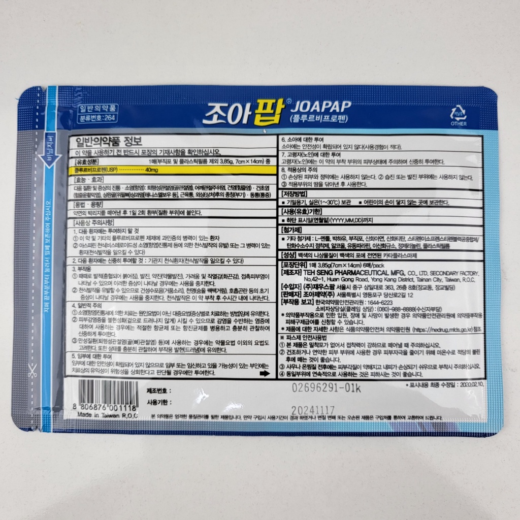 [Joapop] flurbiprofen Pain Relieving Patch, degenerative arthritis, osteoarthritis, myalgia, shoulder arthritis, paronychia, tennis elbow pain (shoulder, waist, knee area), 6p