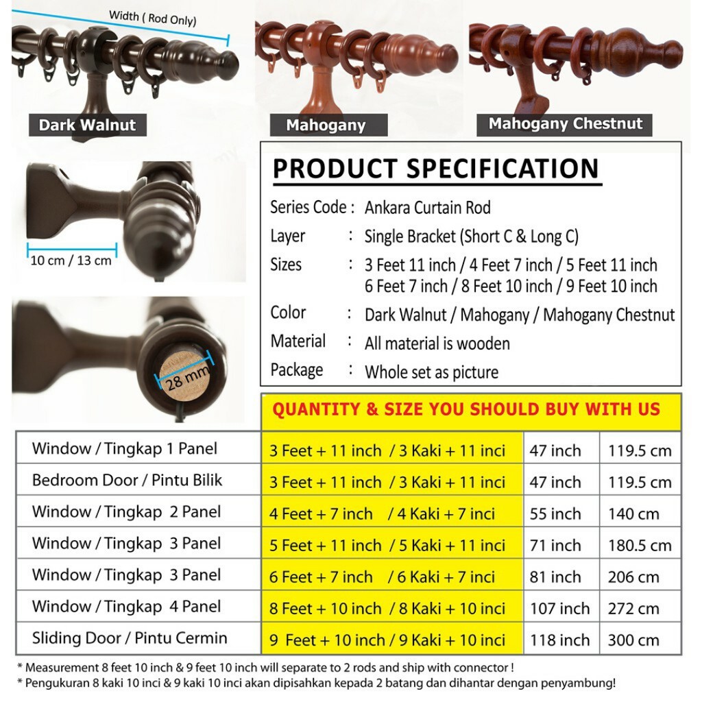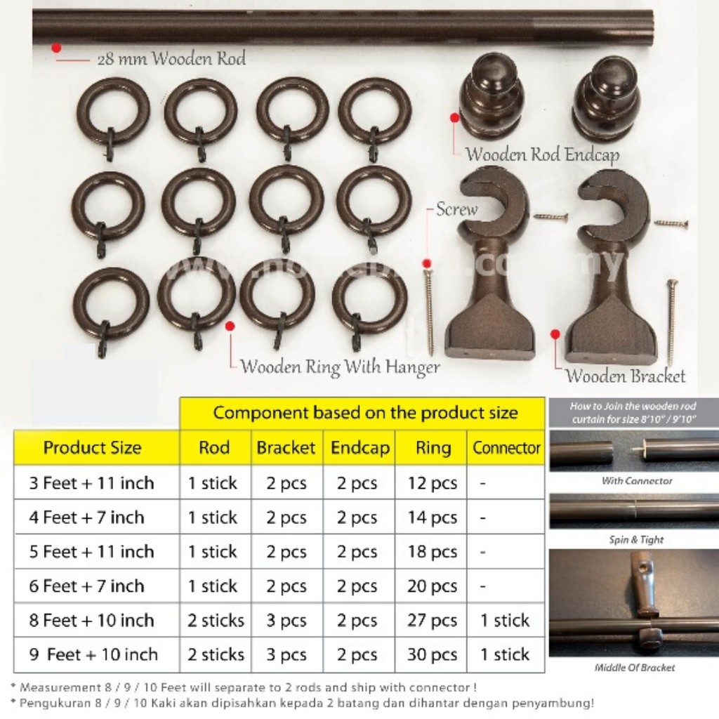 [KAYU LANGSIR MURAH] Wooden Curtain Rod / Kayu Langsir / 6 Size Available