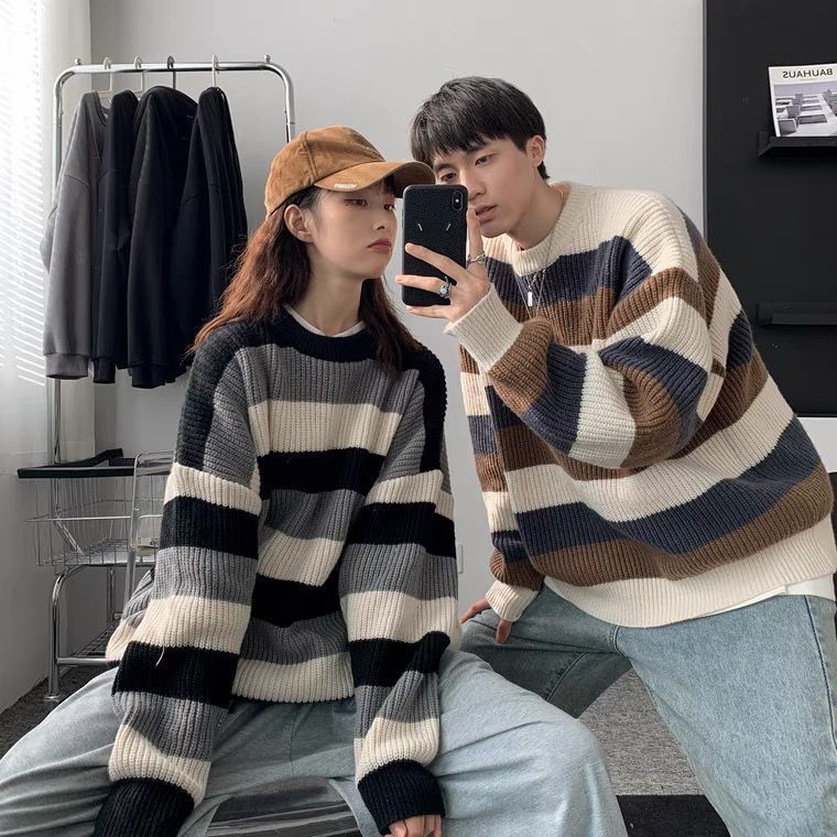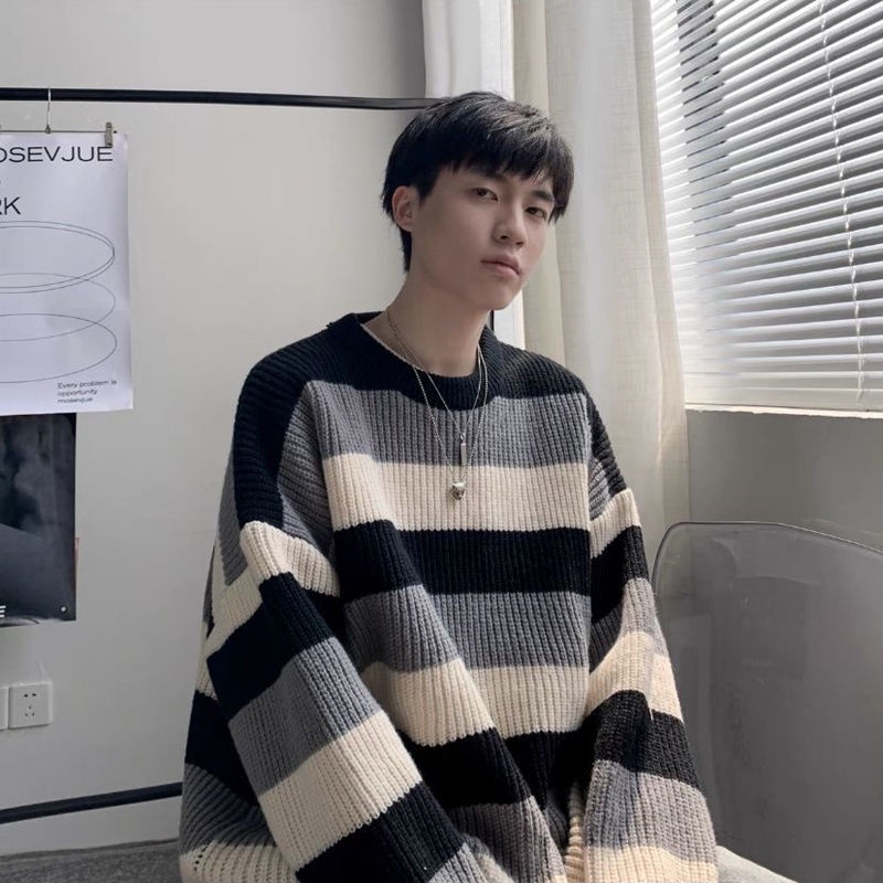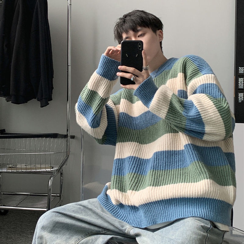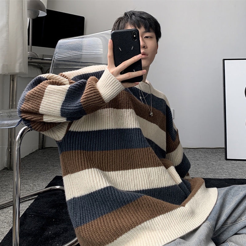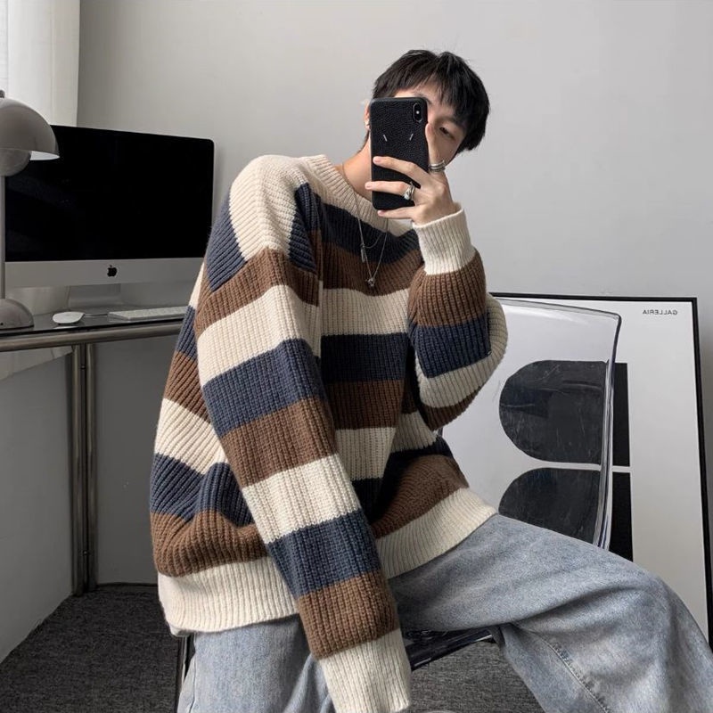 #Men's Sweater#Striped Color Matching Sweater Men's Autumn Winter ins Trendy Loose Bottoming Top Retro Round Neck Hong Kong