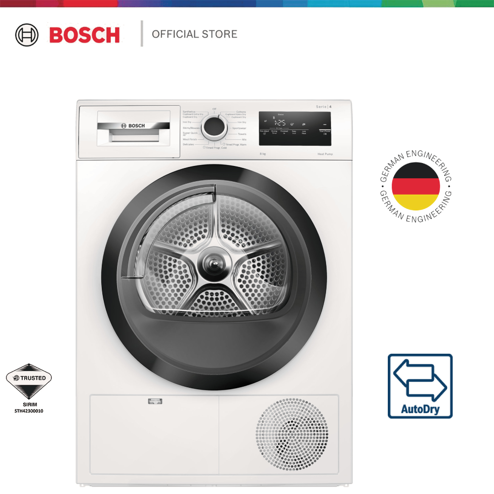 [NEW] Bosch Series 4 8kg White Heat Pump Dryer with AutoDry and QuickDry - WTH85008SG