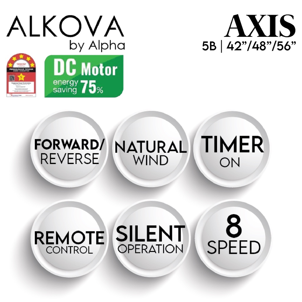 [NEW MODEL 2022] ALKOVA (ALPHA) AXIS/5B 42" / 48" / 56" INCHES DC REMOTE CEILING FAN (NEW) + FREE GIFT