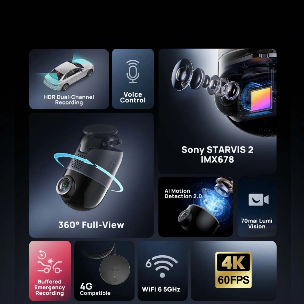 [NEW] 70mai Omni X800 360° Dashcam 4K Resolution | 4G Connectivity | AI Motion Detection | Buffered Emergency Recording