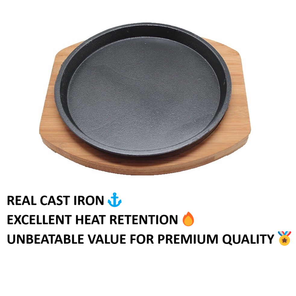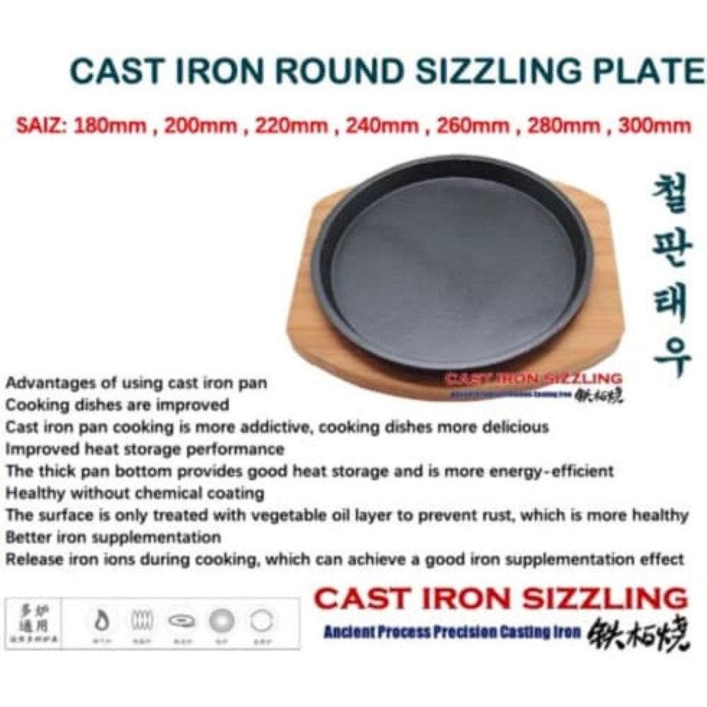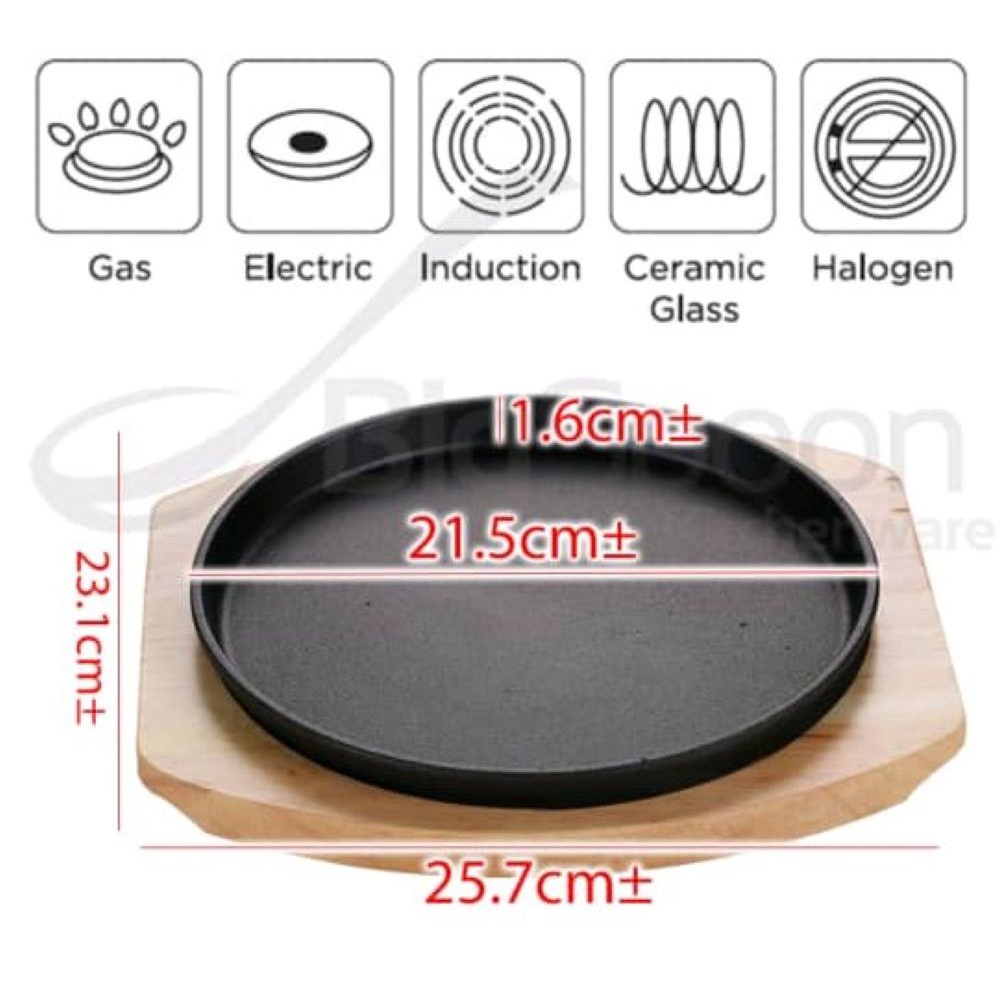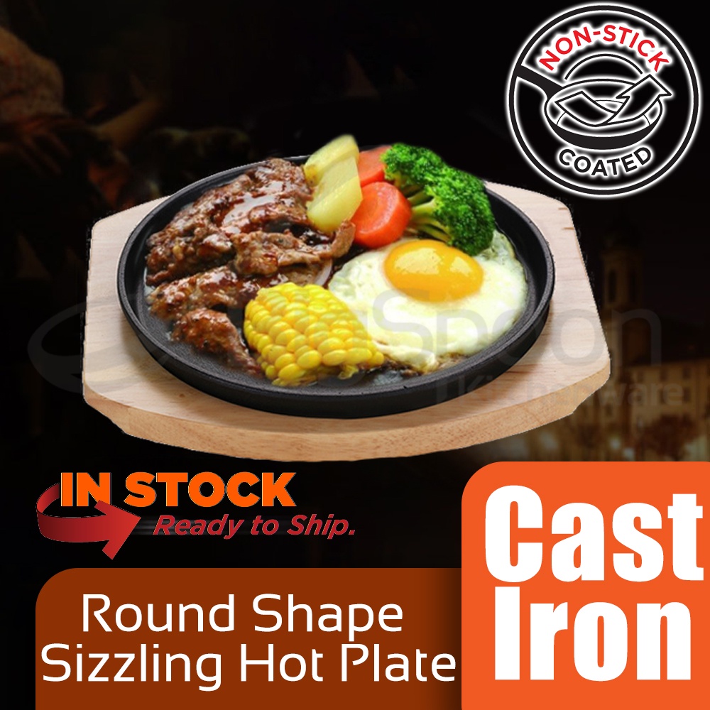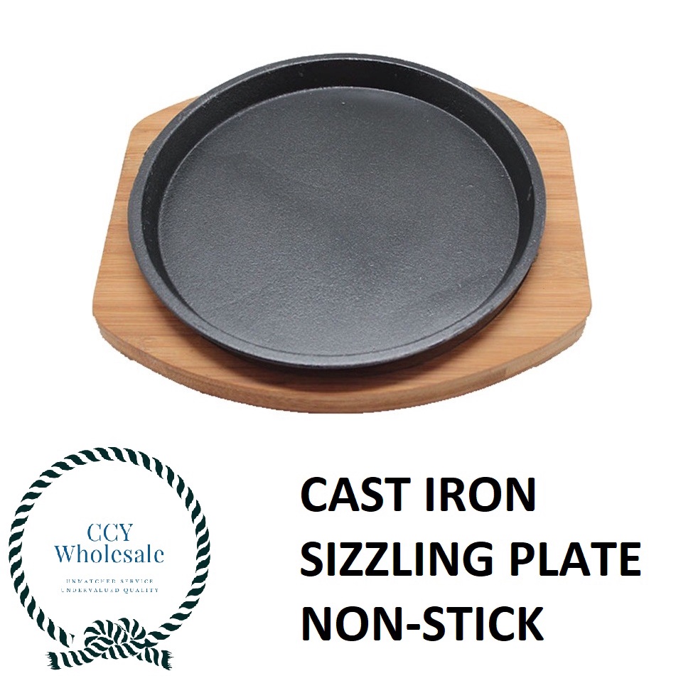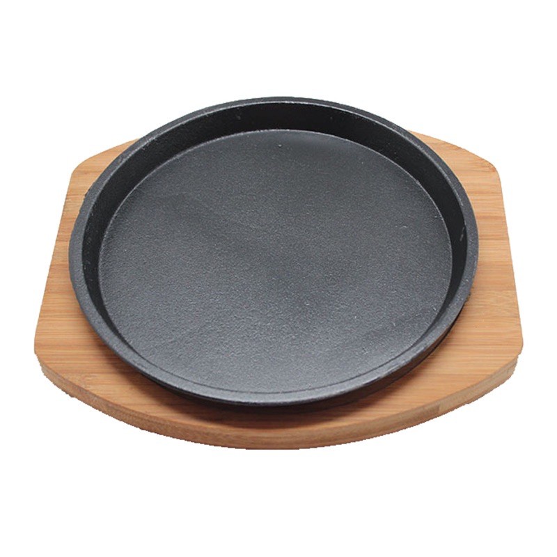 [Non-stick] Cast Iron Sizzling Round Plate with wood base Pinggan Besi Teppanyaki