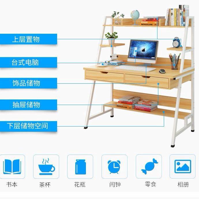 [READY STOCK] Modern Study Table with Hidden Book Shelves, Double Drawers Built-Up 5-Compartments Shelves (Light Brown)
