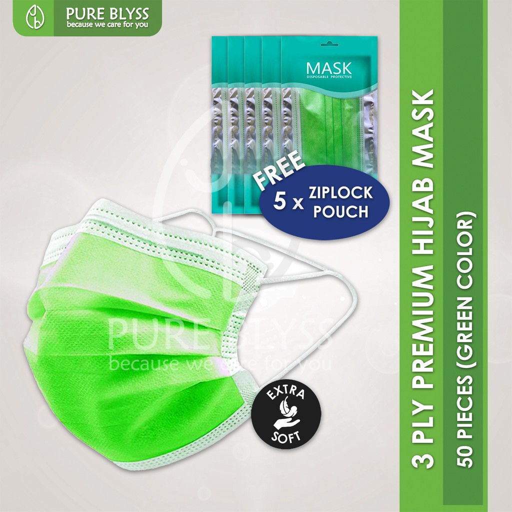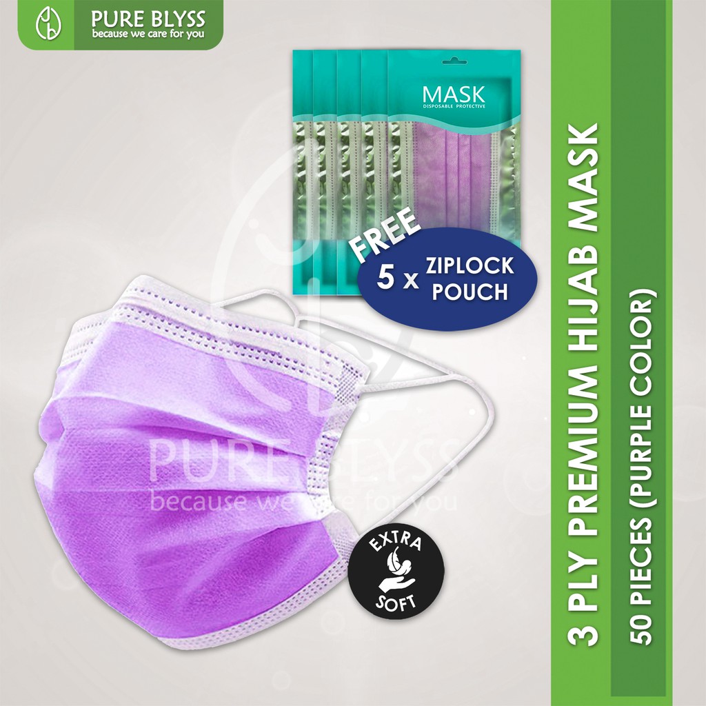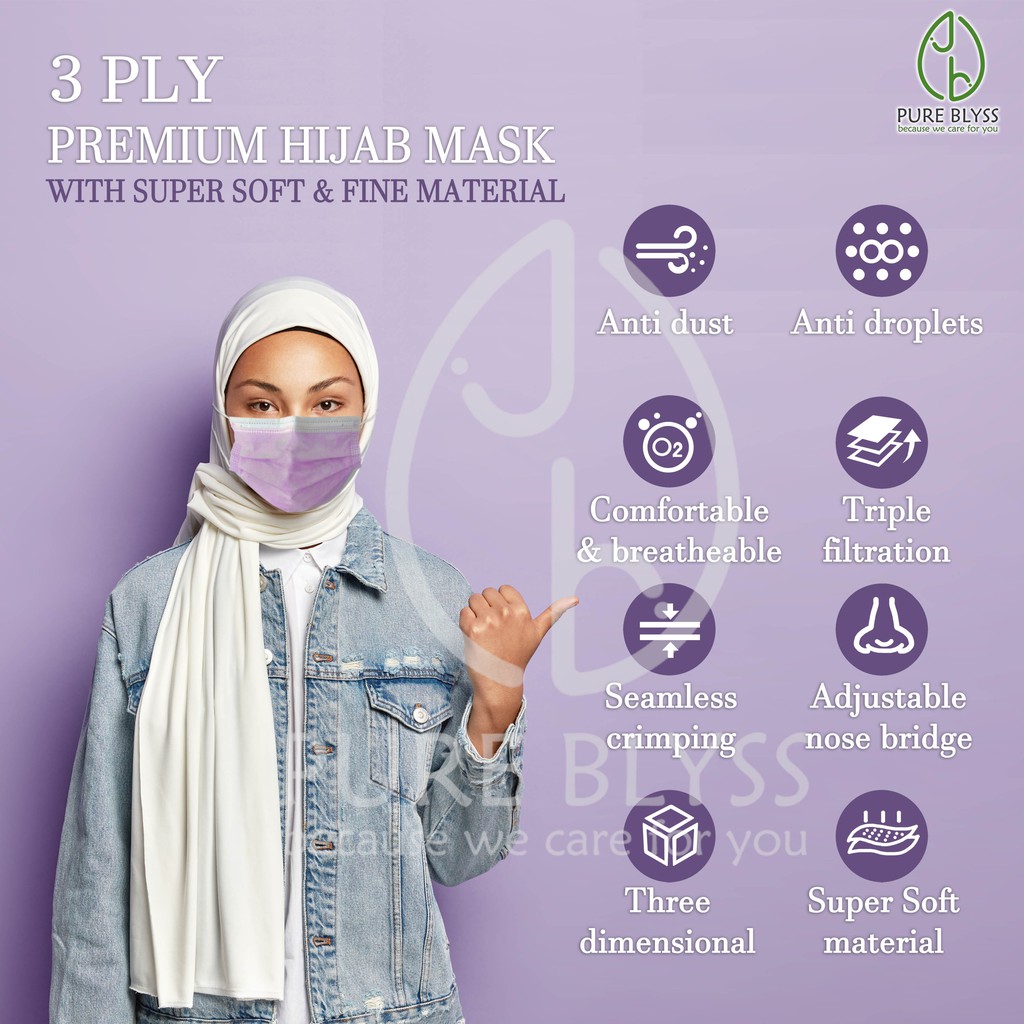 [Ready Stock] Pure Blyss PREMIUM HIJAB Mask 50pcs 10pcs Disposable BFE95 Face Mask Muslimah Woman Headloop Tudung Colour