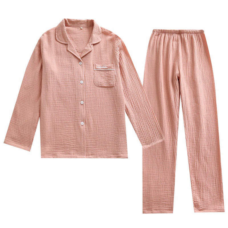 [Ready Stock] Women & Men 100% Cotton Crepe Long Sleeve Trousers Pajamas Set Solid Color Pyjamas Baju Tidur Nightwear Sleepwear Korean Pijamas Couple Pajamas