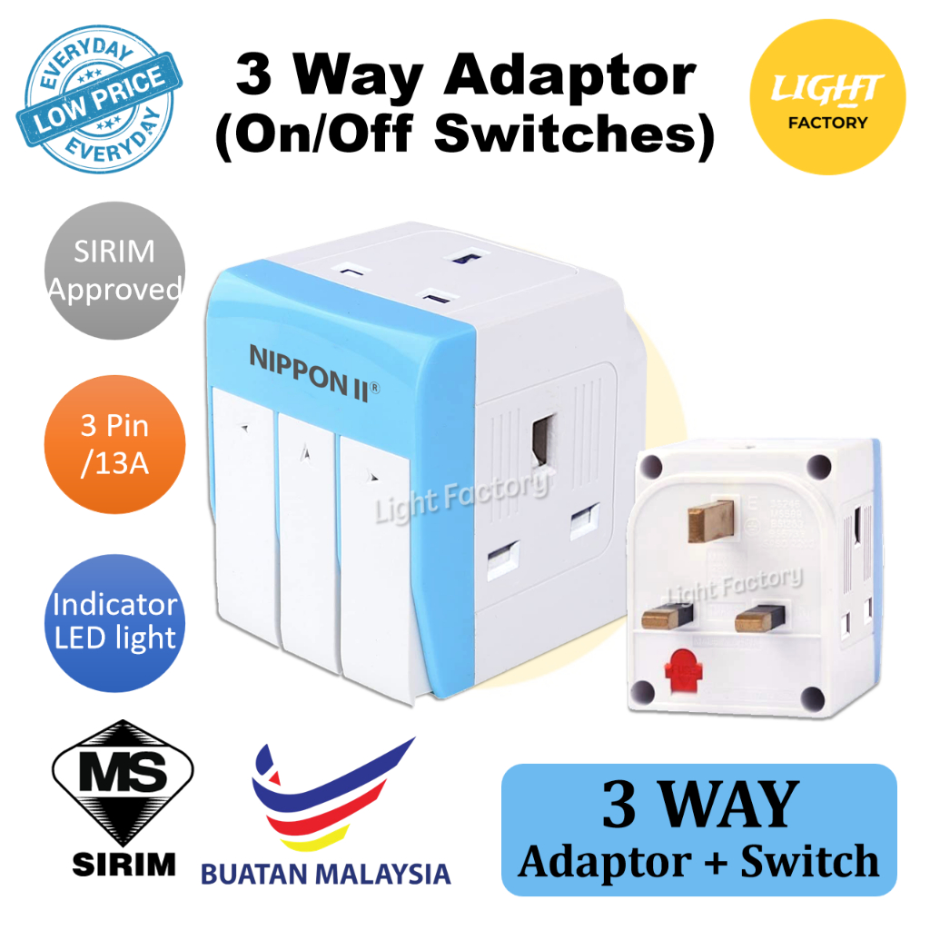 [SIRIM Approved] 3 Way Adapter with Switch 3 Way Multi Adaptor 13A 3 Pin Plug Socket with Neon Light Universal Adapter