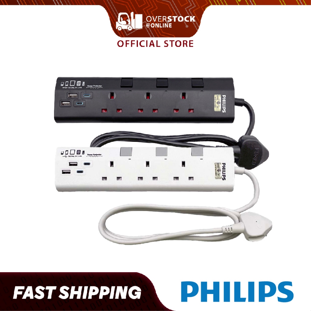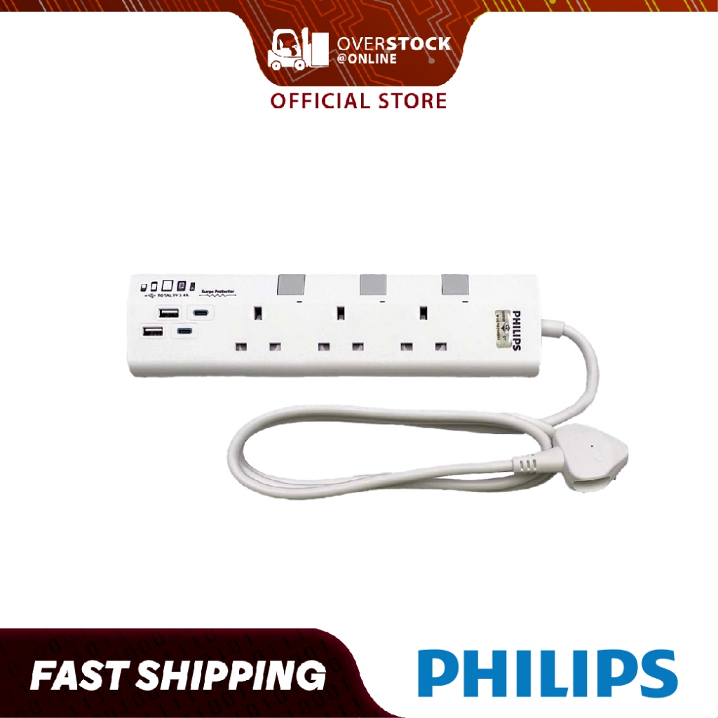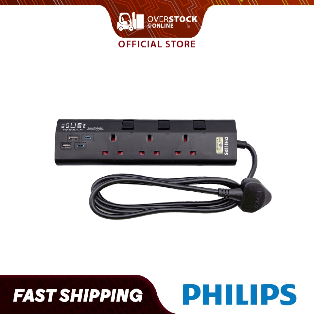 [SIRIM Approved] PHILIPS CHP4732 3 Way Extension Socket with 2 USB and 2 Type-C Port, Surge Protection & 2m Cable Length