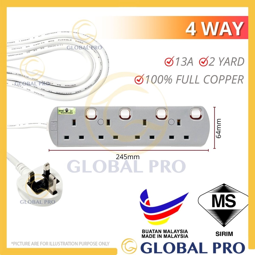 [SIRIM] UMS 13A 2 Yard Trailing Plug Extension Electric Power Portable Socket w Neon Light UMS TRAILING Extension Plug