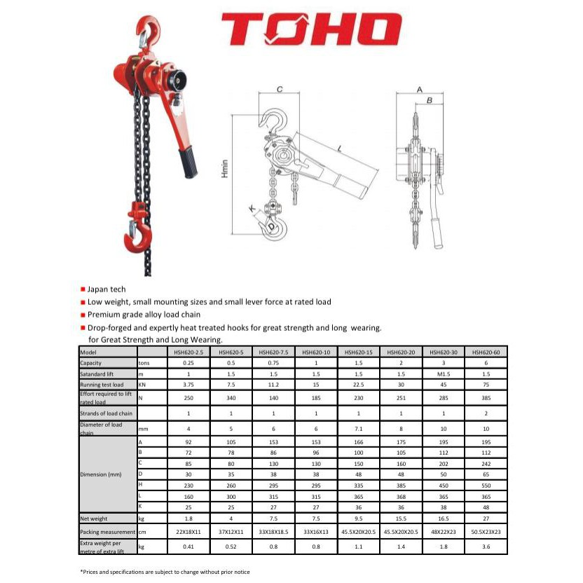 0.5 Ton X 1.5 Meter TOHO Manual H/D Lever Block / Ratchet Puller Hoist