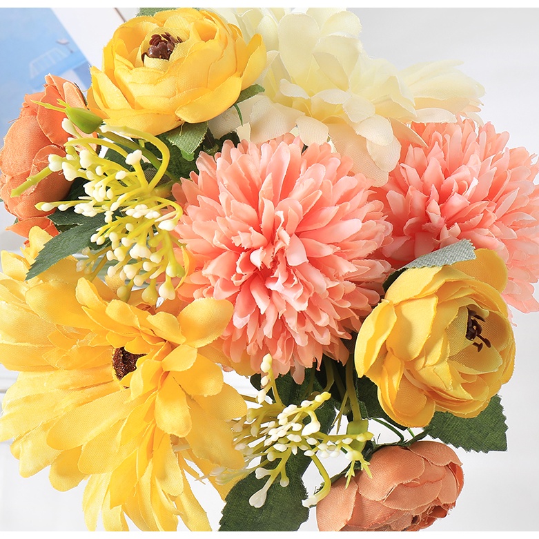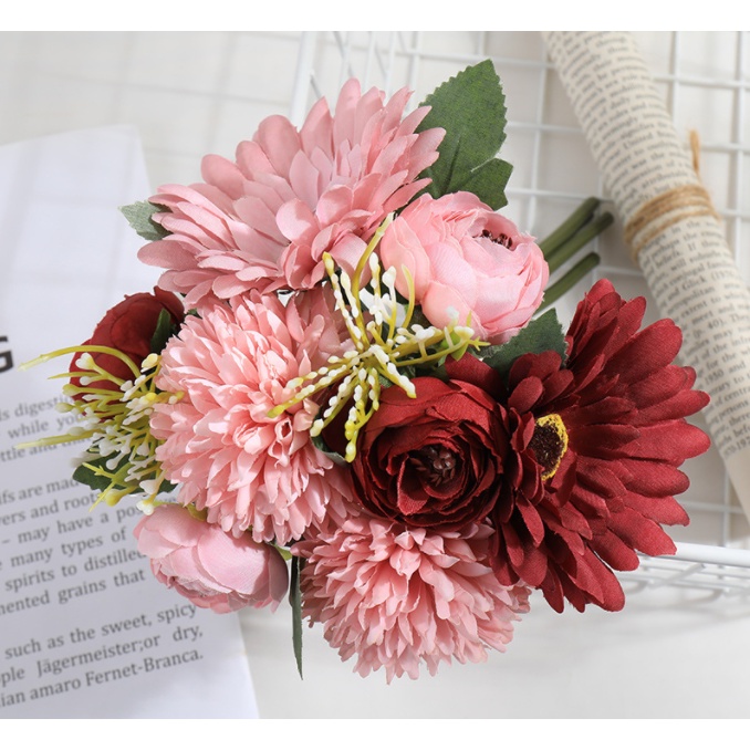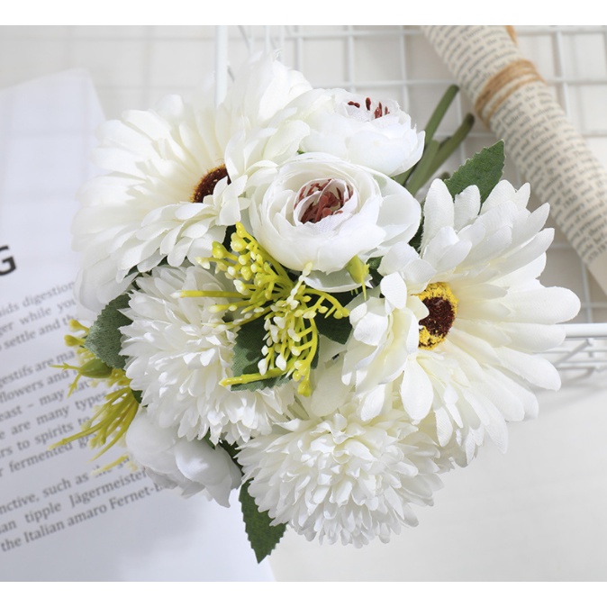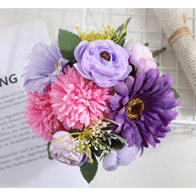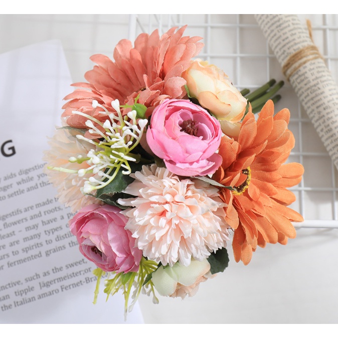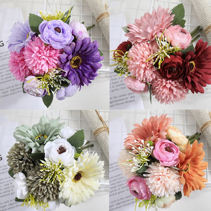 1 Bouquet Artificial Flower Rose Gypsophila Lily Dandelion Peony Combination Bouquet Fake Flowers Wedding Home Decoration